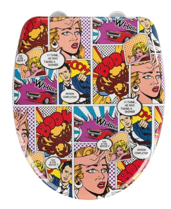 Καπάκι τουαλέτας Pop Art, WENKO με σύστημα soft close, ανοξείδωτα στηρίγματα και μεγάλη αντοχή σε γρατσουνιές. Κατασκευασμένο με ειδική μέθοδο από υλικό σε σκόνη που συμπιέζεται για αρκετά λεπτά κάτω από υψηλή θερμοκρασία και πίεση. Με πολλή σκληρή, πολλή ανθεκτική